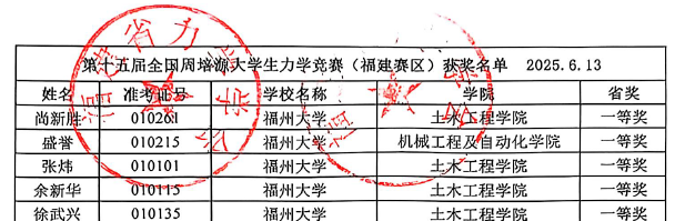 经校级初赛选拔,十大网投官网澳门网投十大信誉平台4名学生组成代表队,由蔡清池老师指导,邓智辉老师领队,前往福州大学参加全国周培源力学竞赛(福建赛区)。在三个半小时的答题时间里,要求同学们充分运用自己的力学知识储备,披荆斩棘,完成本次赛题的挑战。最终,刘杰锋同学获福建赛区二等奖,全国优秀奖;郭佳兴、林于蓁同学获福建赛区三等奖。