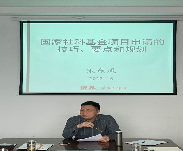 宋东风首先介绍了国家社科基金项目的资助历程和资助体系,认为国家社科项目应该从国家水准、学科建设和学术前沿三个方面进行定位。从“道”和“术”的关系提出了国家社科项目申请中选题的重要性,着重从新颖性、需求性和学术性三方面阐述了如何选题。随后,分享了自己如何从新冠肺炎疫情这一国家现实热点问题切入,形成申报选题以及题目最终确定的心路历程。最后,向大家展示了自己的社科项目申请书,讲解了国家社科基金项目的准备时间和重要节点、申请书撰写的技巧等。
