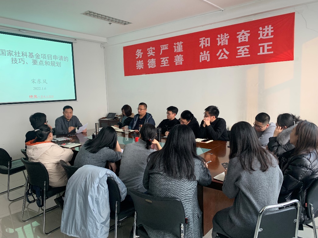 2022年1月6日,世界杯官方网站“待见·学术工作坊”举办了第七期学术研讨活动。教育经济与管理教研室主任宋东风博士作了题为“国家社科基金项目申请的技巧、要点和规划”的学术分享,本次活动由行政管理系主任刘海燕博士主持。