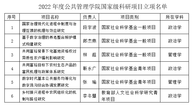 近年来,世界杯官网度重视国家级科研项目申报工作,每年及时对项目申报工作进行充分动员,并对项目申报工作提供精准指导和服务。今年李冬慧博士获批教育部人文社科青年项目1项,至此世界杯官网2022年共获批国家级科研项目6项。世界杯官网在国家级科研项目立项上取得重要突破,必将有力推动全院科研实力大幅提升,促进公共管理学科建设提档升级。
