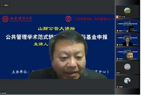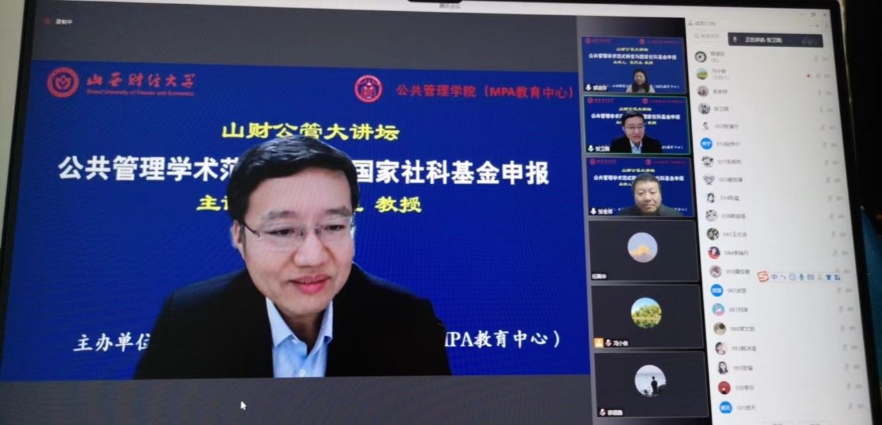 2022年11月12日晚,世界杯官方网站主办的“山财公管大讲坛”第二场开讲。第二届全国公共管理专业硕士(MPA)教育指导委员会委员,曾任天津大学MPA教育中心主任的张再生教授拨冗莅临并做了题为“公共管理学术范式转变与国家社科基金申报”的报告。校党委常委、副校长、教育经济与管理学科带头人张卫国教授主持了本次大讲坛,来自校内外150余名师生在线聆听了报告。