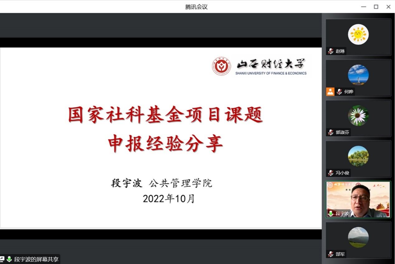 2022年11月1日下午,世界杯官方网站通过“尚公青年沙龙”学术平台举办第三场国家级科研项目申报经验交流会,学院副院长、2022年国家社科基金项目主持人段宇波副教授做了《国家社科基金项目课题申报经验分享》的报告,副院长冯小俊主持了交流会,100余名师生在线参加了经验交流会。