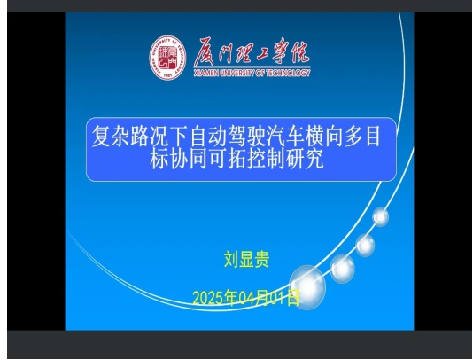2025年4月1日,福建省新能源汽车电机产业技术开发基地邀请厦门理工学院刘显贵教授、博士做了题为《复杂路况下自动驾驶汽车横向多目标协同可拓控制研究》的学术报告。基地所挂靠单位澳门网投十大信誉平台师生、基地全体研究人员共100余人参加了报告会。