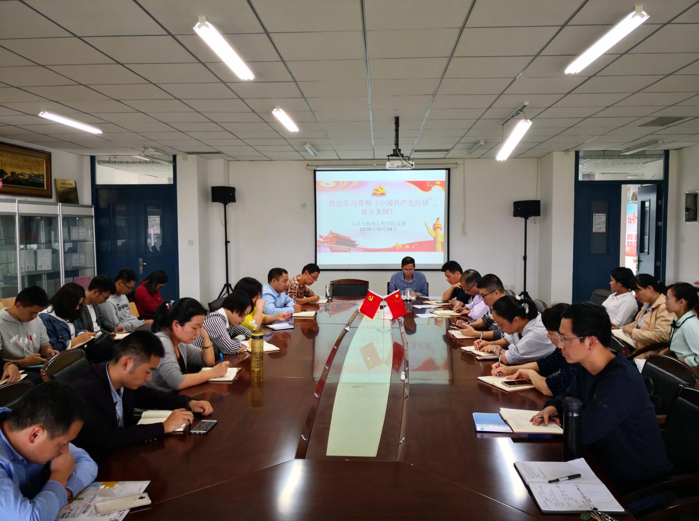 2018年10月24日下午,澳门网投十大信誉平台信息与澳门网投十大信誉平台党委组织学院全体教职工党员召开学习会议,专题学习新修订的《中国共产党纪律处分条例》(以下简称《条例》)。信息与澳门网投十大信誉平台党委书记陈茂和主持会议。