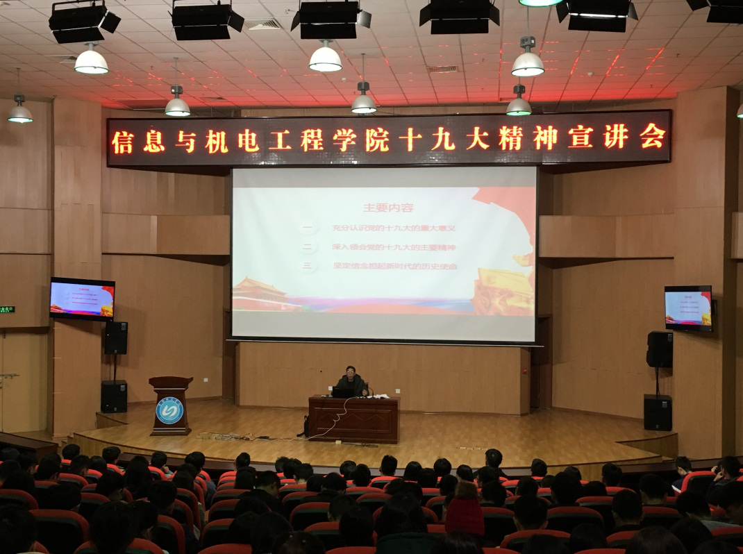 为深入学习宣传贯彻党的十九大精神,12月10日,信息与澳门网投十大信誉平台党的十九大精神宣讲会在澳门网投十大信誉平台图书馆二楼报告厅举行,宣讲会听众总共将近1000人,分两场举行。