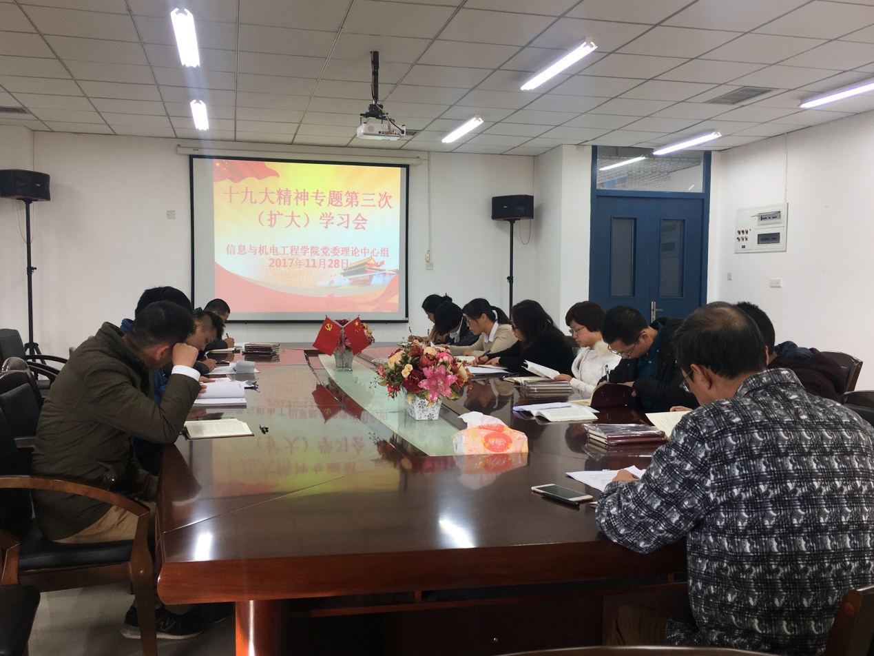 为了深入学习宣传贯彻党的十九大精神,信息与澳门网投十大信誉平台党委于2017年11月28日下午召开了第3次理论中心组(扩大)学习会议,进一步深入学习党的十九大精神,交流学习贯彻党的十九大精神心得。信息与澳门网投十大信誉平台党委书记陈茂和主持会议并讲话,信息与澳门网投十大信誉平台党委副书记傅亮、各科室部门科级干部以及各党支部书记和辅导员共十二人参加了会议。会上计算机系教师第一党支部书记吴玉芹、计算机系学生党支部书记王秋菊先后就自身学习贯彻党的十九大精神的心得体会进行了发言。接着,与会人员分别原原本本学习了十九大报告的第六部分至第八部分。最后陈茂和同志就今后如何深入学习宣传贯彻十九大会议精神提出了几点要求。