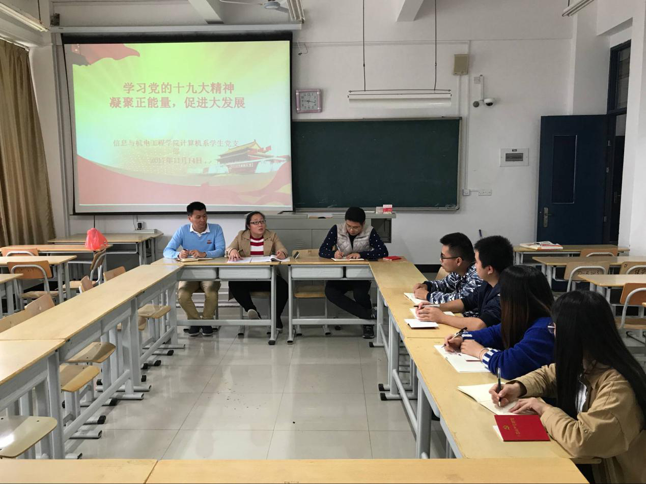 2017年11月14日,信息与澳门网投十大信誉平台计算机系学生党支部在DB403召开全体党员大会,开展了学习党的十九大精神“凝聚正能量,促进大发展”的主题党日活动。党员们一致认为:深入学习宣传贯彻党的十九大精神,是当前和今后一个时期首要政治任务。同时,必须加强党对意识形态工作的领导,牢牢把握意识形态领域话语权和主动权。要旗帜鲜明讲政治,身体力行作表率,严格落实意识形态工作责任制,切实加强阵地建设和管理,对错误思潮、言论、观点正面回击,使校园主旋律更加响亮,正能量更加强劲,教育引导广大师生坚定理想信念,志存高远,脚踏实地,锐意进取,勤于学习,埋头苦干。