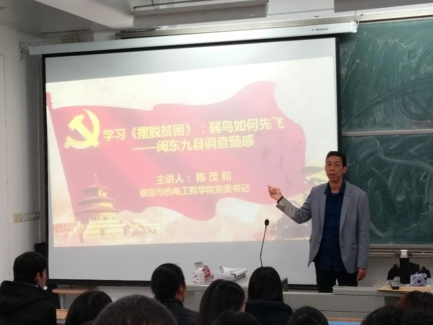 为号召2017级新生积极参与到学习《摆脱贫困》中来,11月8日晚,信息与澳门网投十大信誉平台党委陈茂和书记在求是楼B201教室为2017级新生开展题为“学习《摆脱贫困》:弱鸟如何先飞——闽东九县调查随感”的主题党课。