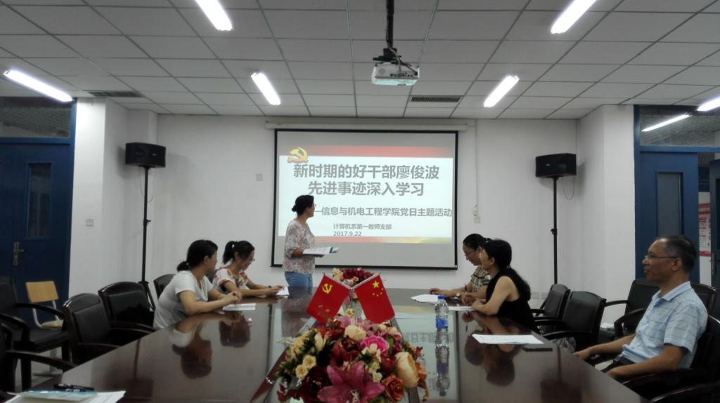 2017年9月22日16:20点,信息与澳门网投十大信誉平台计算机系教师第一支部在DA408会议室组织开展深入学习廖俊波同志先进事迹,争做一名优秀共产党员活动,章立亮、李豫颖、陈可华等本支部六位教师全部出席了本次活动。