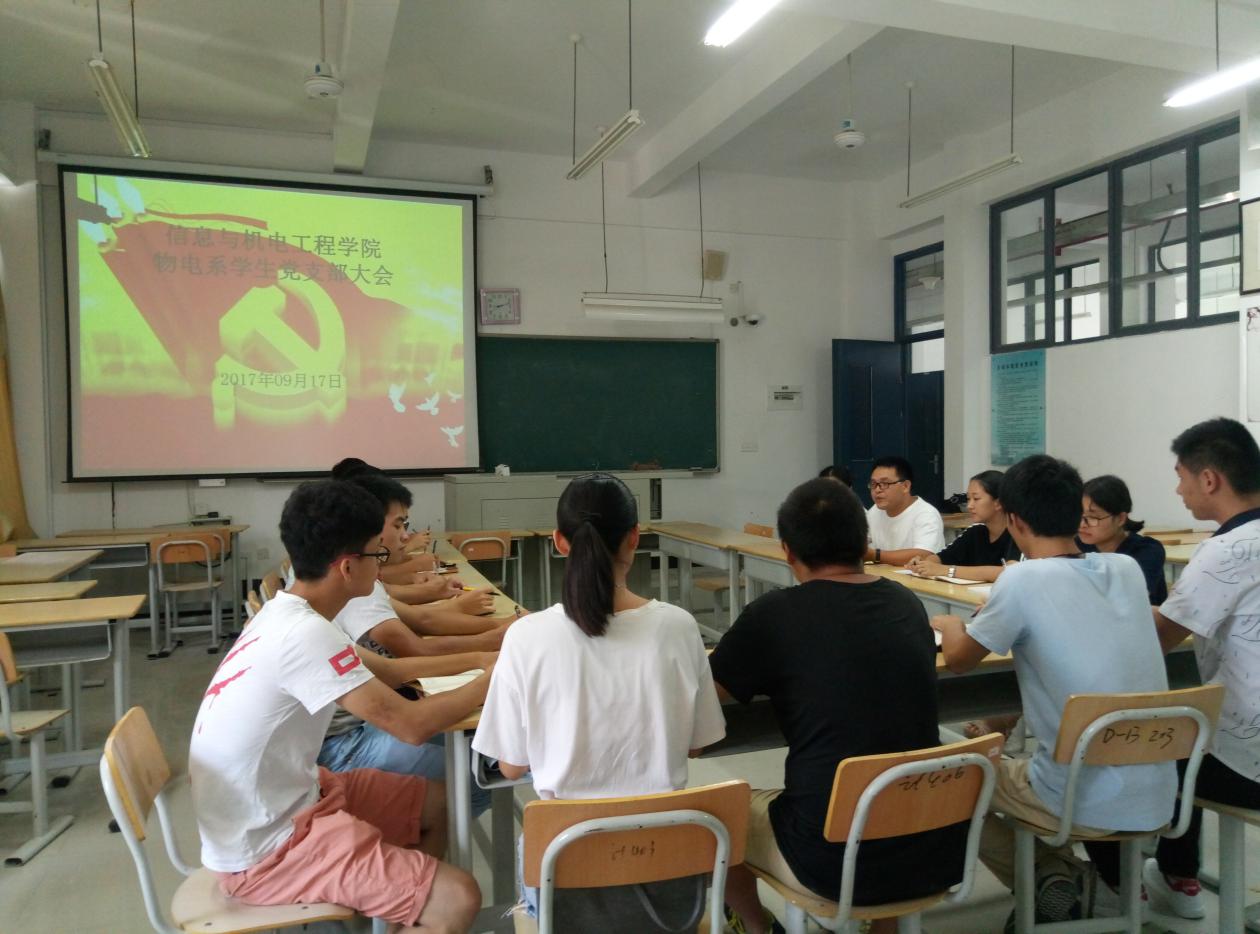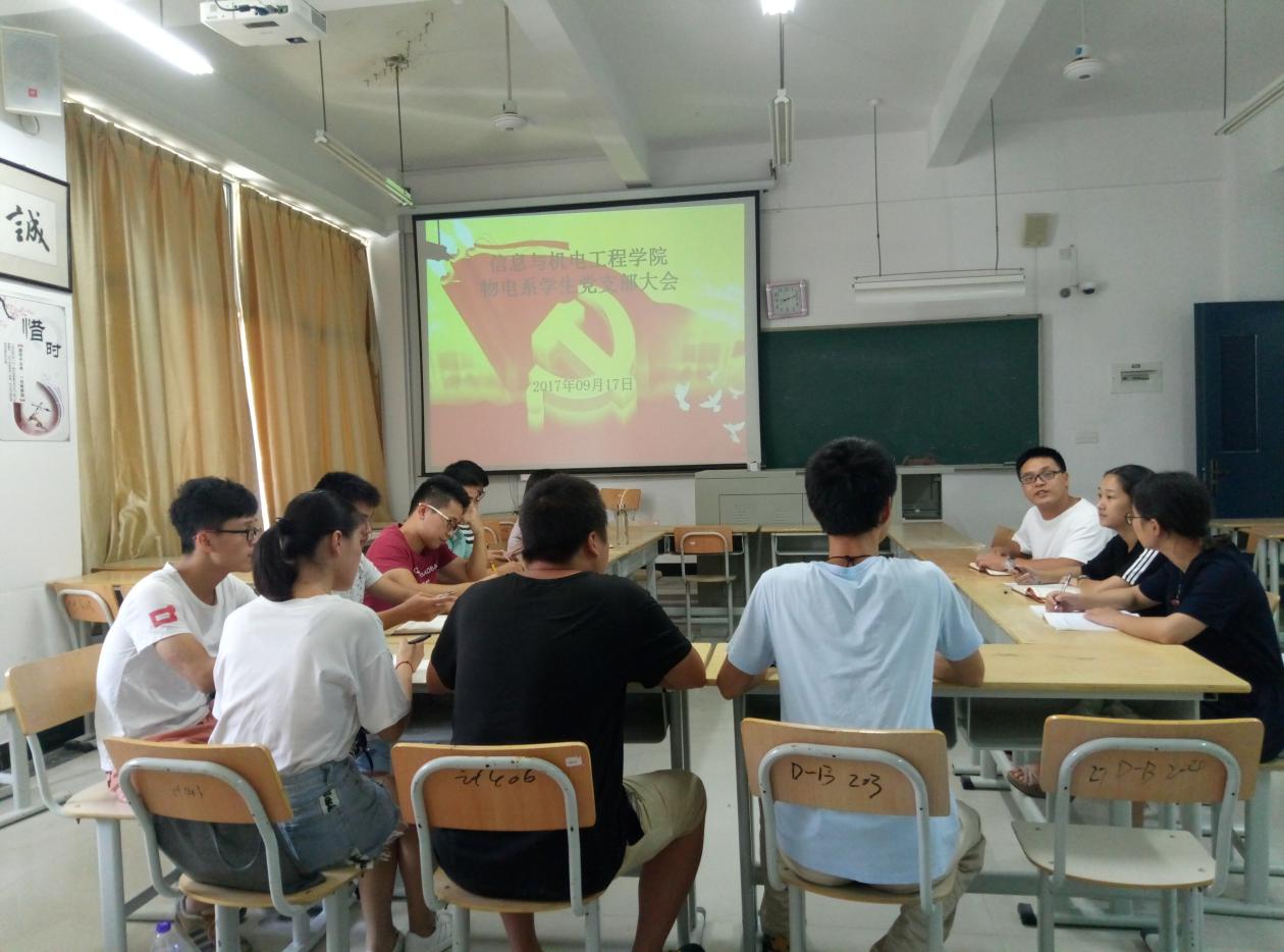2017年9月17日下午,信息与澳门网投十大信誉平台物理程系学生党支部全体党员在DB407教室召开会议,本次会议由学生党支部书记卓敏主持召开。会议上卓敏老师指出学生党员必须要树立起带好头的作用,不管是在学习上还是在生活上都要给周围的同学树立好榜样。要不断提升自身的党性修养,更好的发挥党员先锋模范作用。