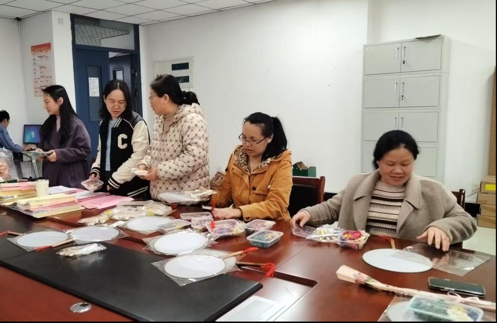 活动伊始,院领导向全体女教职工致以节日的问候和美好的祝福,对她们为学院发展做出的贡献表示感谢,并希望她们继续发扬“自尊、自信、自立、自强”的精神,在各自的工作岗位上再创佳绩。随后,结合团扇的文化背景、制作工艺以及花材搭配技巧视频的观看。女教师们纷纷拿起手中的材料,发挥想象力和创造力,将干花、绿叶等材料精心粘贴在团扇上。