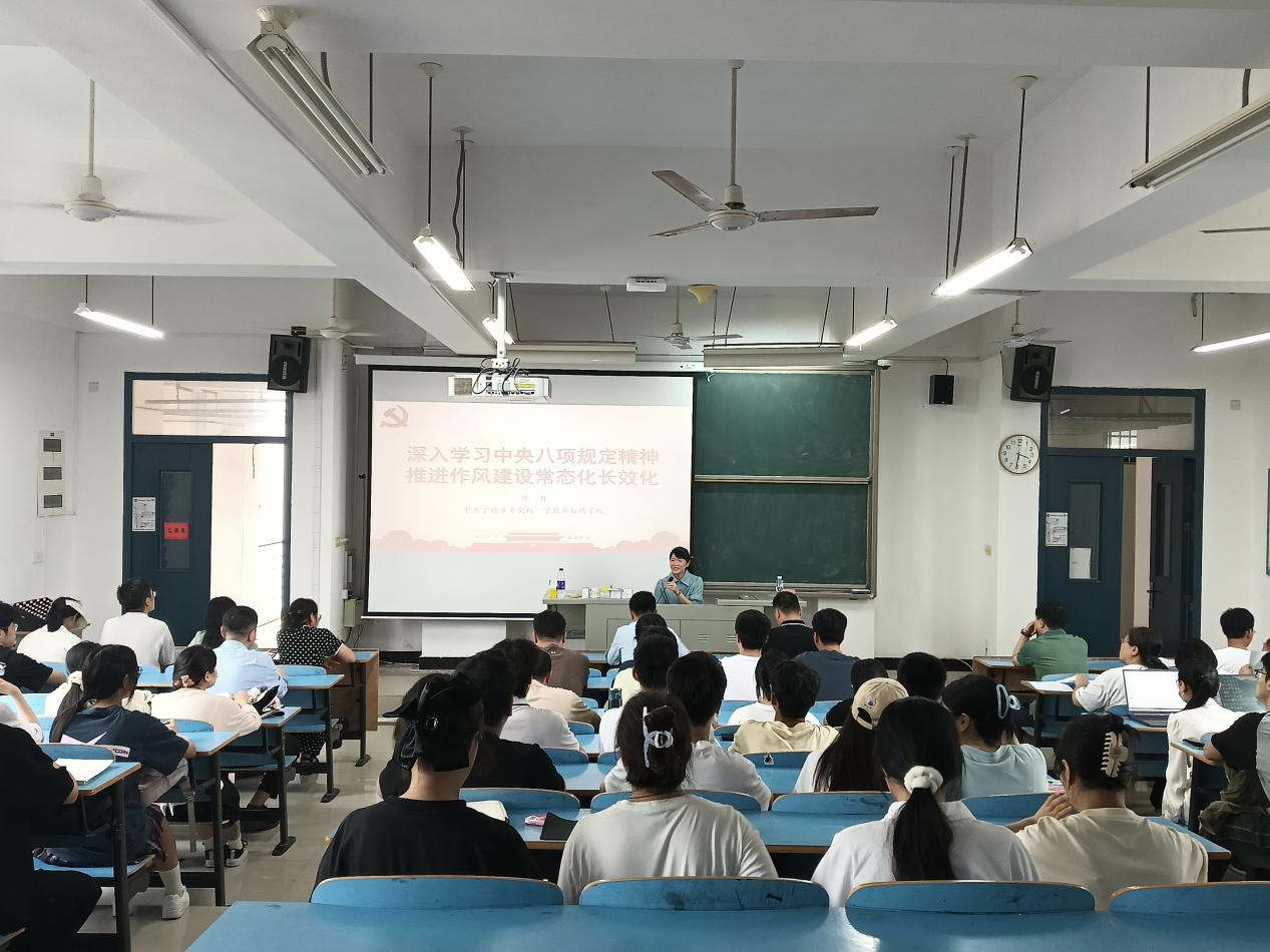 为贯彻落实党的二十届三中全会部署,巩固拓展学习贯彻习近平新时代中国特色社会主义思想主题教育成果,巩固深化党纪学习教育成果,锲而不舍落实中央八项规定精神,持续推动作风建设常态化长效化,澳门网投十大信誉平台按照深入贯彻中央八项规定精神学习教育工作安排,于2025年4月22日邀请中共宁德市委党校、宁德市行政学院党史党建教研室主任,宁德市科学社会主义学会秘书长缪丹作题为《深入学习中央八项规定精神,推进作风建设常态化长效化》的专题讲座,院党委书记傅亮主持讲座,学院师生党员,入党积极分子代表等聆听讲座。