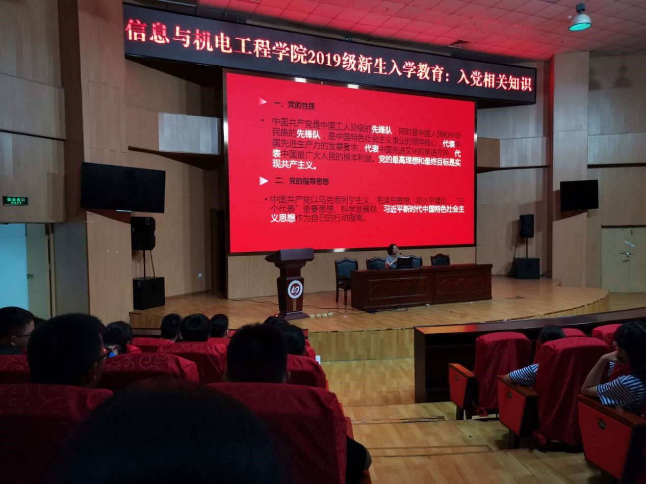 9月16日晚,信息与澳门网投十大信誉平台第一党支部林幼仙老师和第二党支部王昌雷老师在图书馆报告厅为2019级新生开展了入党教育专题讲座,有约260名各班新生到场聆听此次讲座。