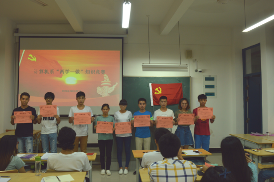 为了全面贯彻党的十八大精神,深入学习贯彻党章和习近平总书记系列重要讲话精神,推动“两学一做”学习教育重点工作,进一步加强基层党组织和党员队伍建设,提升学生党员、积极分子的整体素质,2016年06月07日,计算机系学生党支部在DB405举办“两学一做”知识竞赛。竞赛以班级为单位将学生分为11组,竞赛的内容涉及到党章、习近平总书记系列讲话内容、党史、《细则》、《条例》等。经过激烈角逐,2013级计科(师范)班代表队荣获一等奖;2014级计科(师范)班代表队和2013级计科(非师)班代表队荣获二等奖;2014级计科(非师)班代表队、2015计科(师范)班代表队、2015级计科(专升本)班代表队荣获三等奖。 此次活动让全体学生党员、积极分子接受了一次红色文化的熏陶,达到了推动开展“两学一做”学习教育的预期目标。