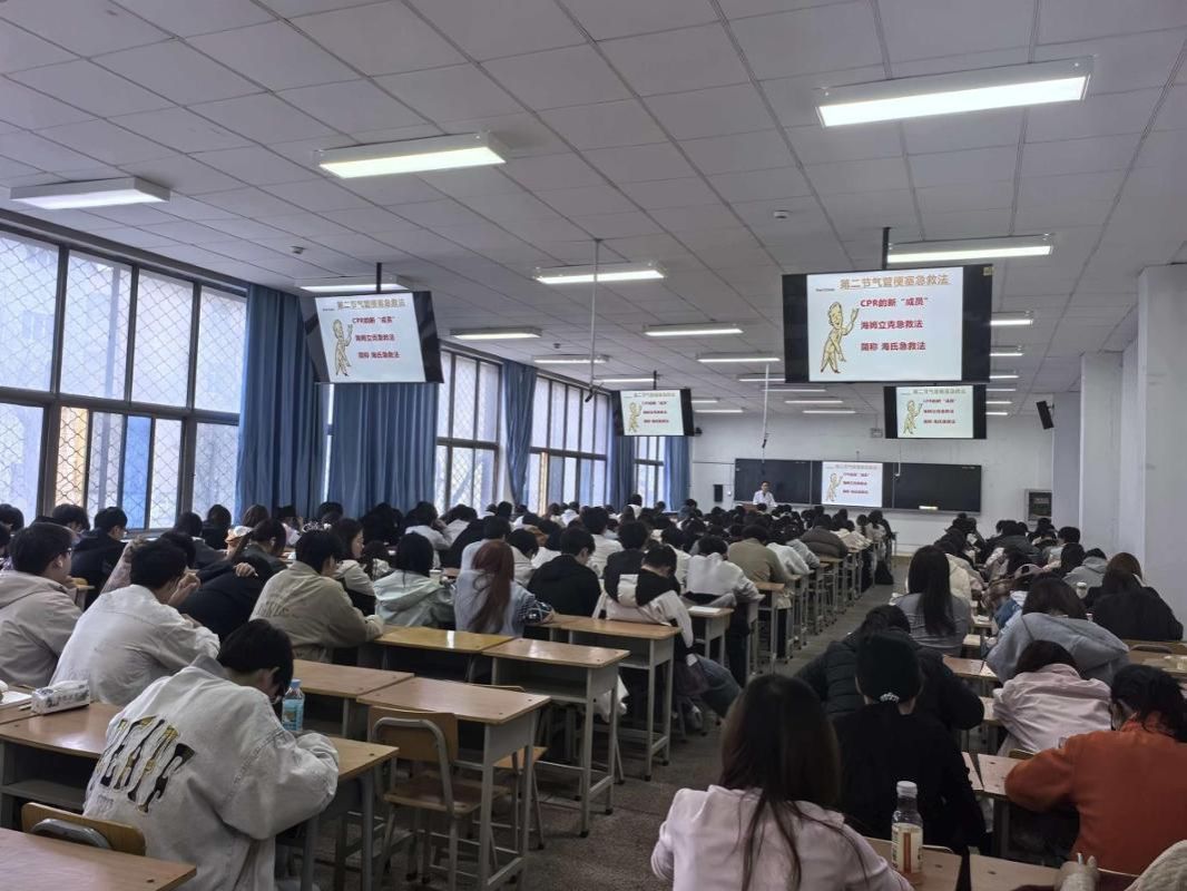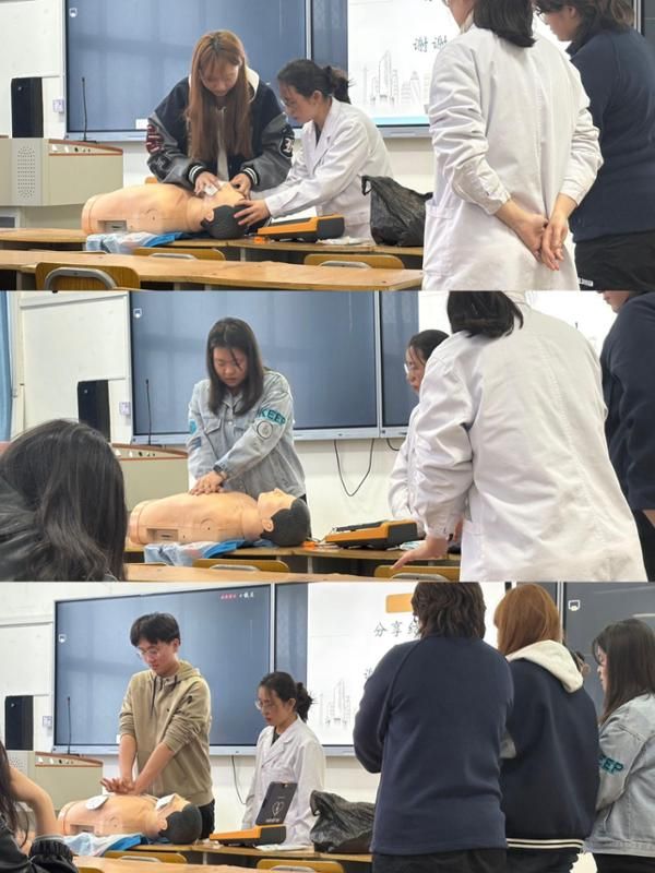 在急救技能教学环节,医护团队通过“讲解+实操”的方式,重点演示了心肺复苏规范流程,从胸外按压的部位、深度、频率,到开放气道、人工呼吸的操作要点逐一拆解示范,并纠正常见操作误区。同时,团队还讲解了海姆立克急救法的应用技巧,以及其他相关常见突发状况的处置方法,传授了低血糖“15-15原则”、呼吸性碱中毒可通过罩住口鼻促进二氧化碳重吸入等实用技巧。现场学生踊跃参与实操练习。