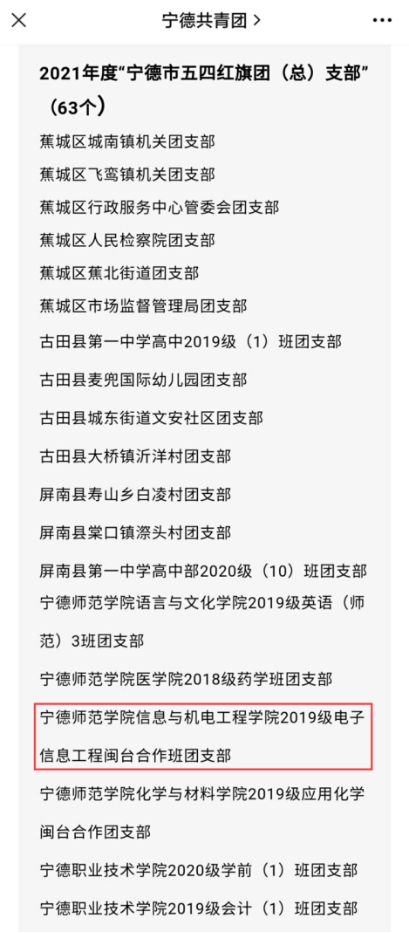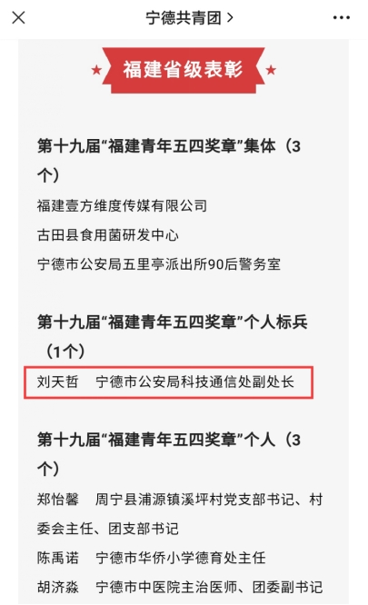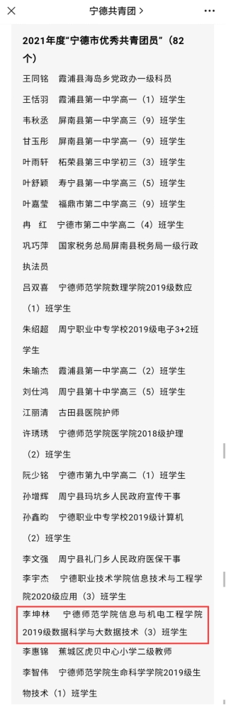 为迎接党的二十大胜利召开、庆祝建团100周年,在五四青年节当天,共青团中央、共青团福建省委和共青团宁德市委集中表彰(表扬)了宁德市124个先进集体和256个先进个人。十大网投官网兼职教授、宁德市公安局科技通信处副处长刘天哲同志荣获第十九届“福建青年五四奖章”个人标兵;2019级电子信息工程闽台合作班团支部荣获2021年度“宁德市五四红旗团(总)支部”称号;2019级数据科学与大数据技术(3)班李坤林同学荣获2021年度“宁德市优秀共青团员”称号。