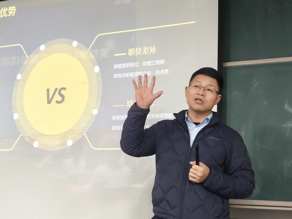 宣讲会伊始,赖联锋院长为活动致辞,深入解读了新能源产学班的设立背景与核心价值。他指出,产学班是学校践行“夯实学业、服务产业、提升就业”三业融合育人理念的重要载体,更是对接宁德本地新能源产业集群优势、精准培养应用型人才的关键举措。赖院长强调,依托学校新能源现代产业学院的平台资源,产学班已构建起成熟的校企协同培养体系,希望同学们把握机遇,踊跃报名,在深耕专业的同时对接产业前沿,成长为符合行业需求的复合型人才。