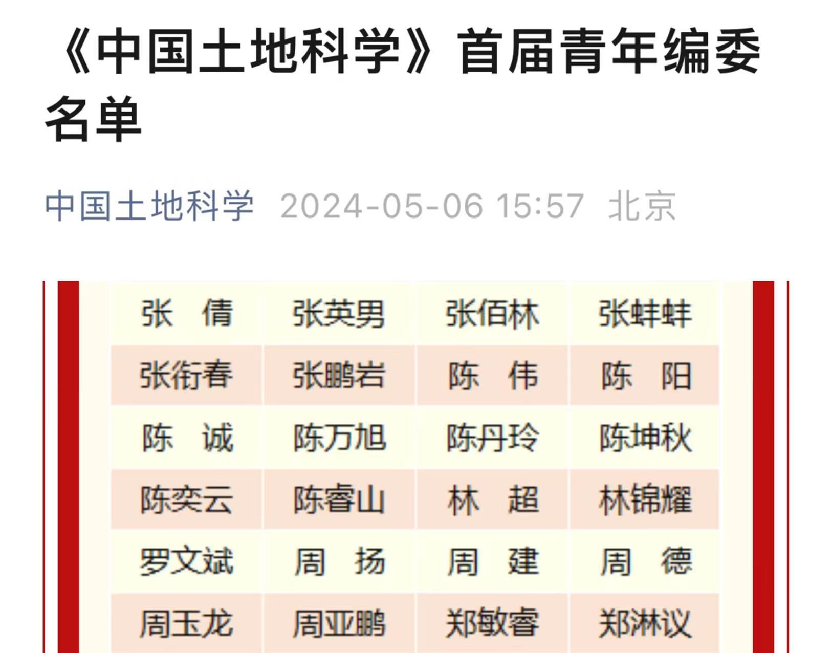 5月6日《中国土地科学》编辑部公布首届青年编委名单,世界杯官网土地资源管理系主任林超副教授成功入选青年编委委员。《中国土地科学》是国内唯一以土地资源管理为主题的全国性权威核心期刊,由中国土地学会、中国国土勘测规划院共同主办,长期致力于推介国内外土地科学最新研究成果,快速报道国内外土地科学创新技术和方法,全面反映国内外土地科学学术思想和观点,推进土地科学研究和技术创新,支持土地资源科学利用和管护工作。