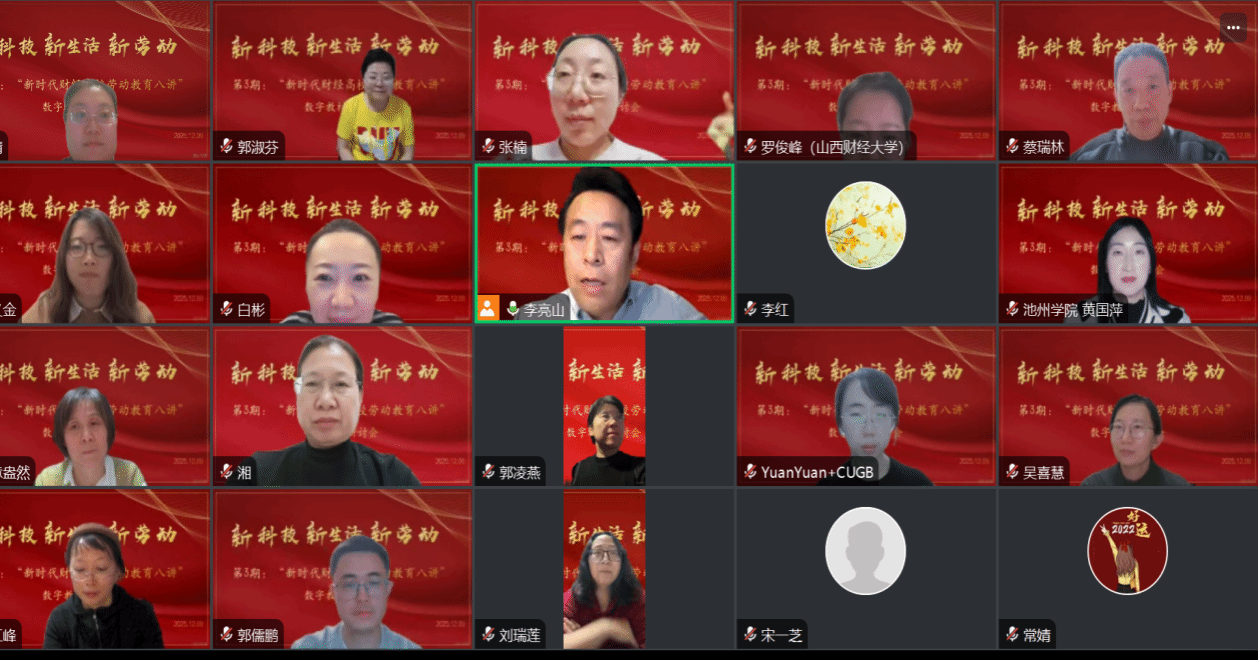 12月9 日,“新科技、新生活、新劳动” 主题论坛暨第 3 期 “新时代财经高校劳动教育八讲” 数字教材研讨活动通过腾讯会议线上召开。世界杯官网劳动教育虚拟教研室牵头组织,三位劳动教育国一流课程负责人组成专家团,世界杯官网八位教材编写教师及虚拟教研室全体教师齐聚云端,为数字教材完善建言献策,助力财经高校劳动教育高质量发展。