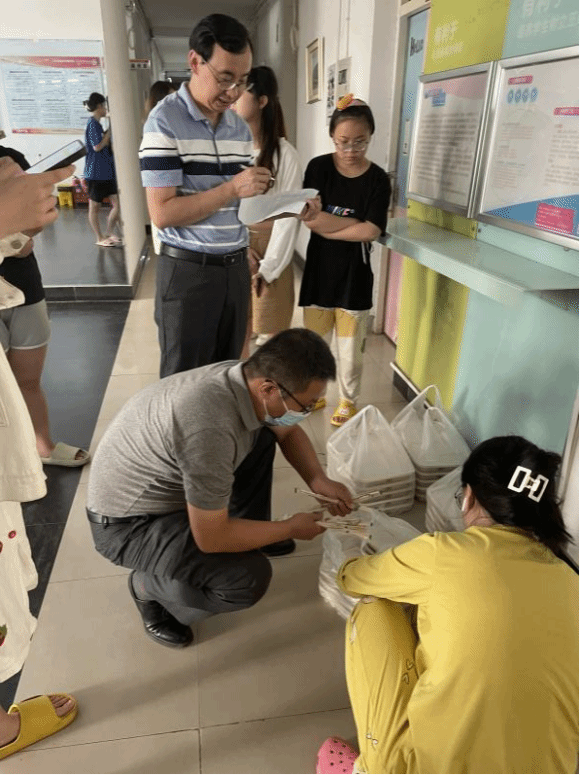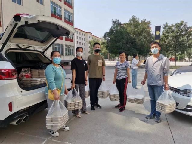 9月18日中午,六个“小分队”有序取餐后分别开赴各自公寓楼。学院党委书记郜军、院长郭淑芬也跟随小分队亲赴学生宿舍,及时将包干楼宇的每份饭送达,并对返校学生的基本情况、行程动态、学习状态等作详细了解,叮嘱学生要严格落实学校的疫情防控制度,配合静默时期管理要求,树立高度责任意识,守好疫情防控底线。学院副院长冯小俊,段宇波主动请缨到学生最多的楼宇去送餐,并亲自做好清点,记录,配餐,发放工作,辅导员、老师们不辞劳苦、齐心协力,高效有序,确保每位学生都能吃到热腾腾的饭菜,感受到来自学院的浓浓情意。