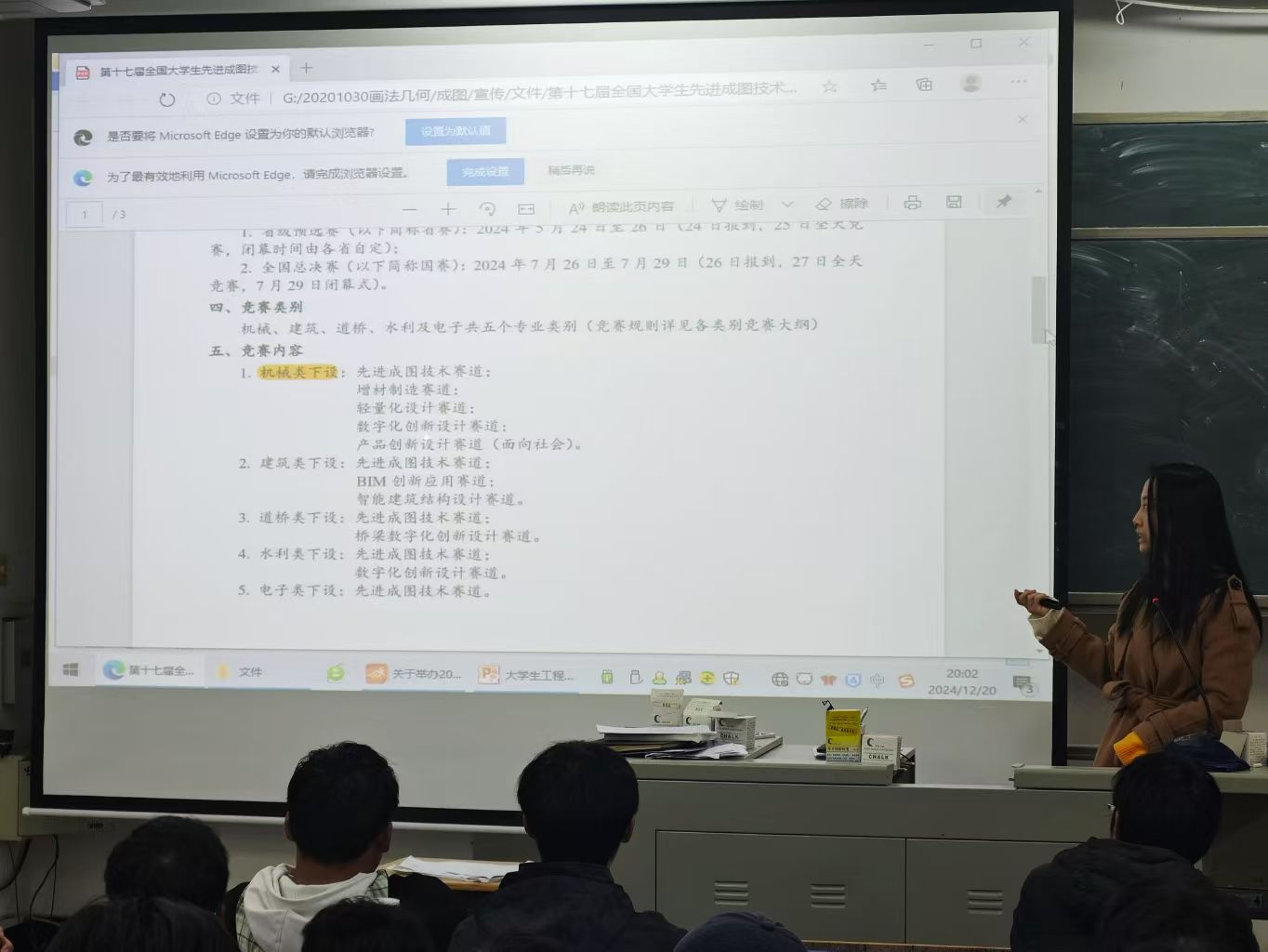 为让同学们了解学科竞赛相关内容,帮助同学们更好地做好竞赛规划,指导同学们高效备赛,为2025年澳门网投十大信誉平台参加学科竞赛奠定坚实基础。12月19日-12月20日,学院组织机械学科竞赛负责老师在DB301阶梯教室讲解机械学科竞赛相关内容,2023级和2024级机械、机械闽台和车辆专业约80余名同学参加讲座。